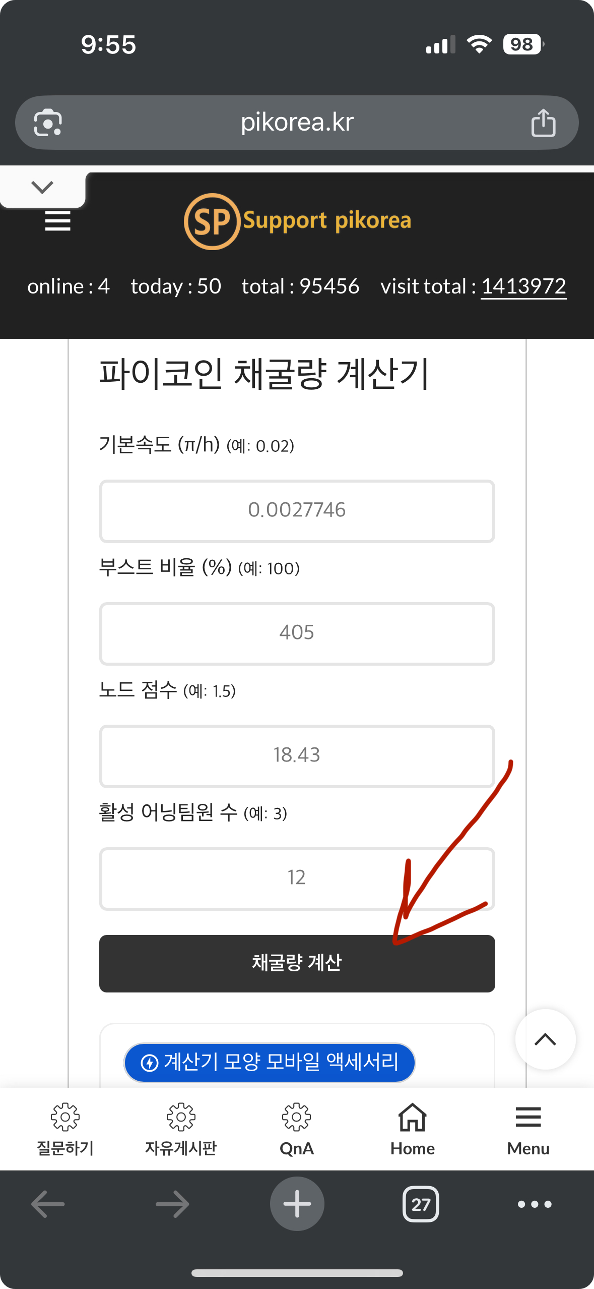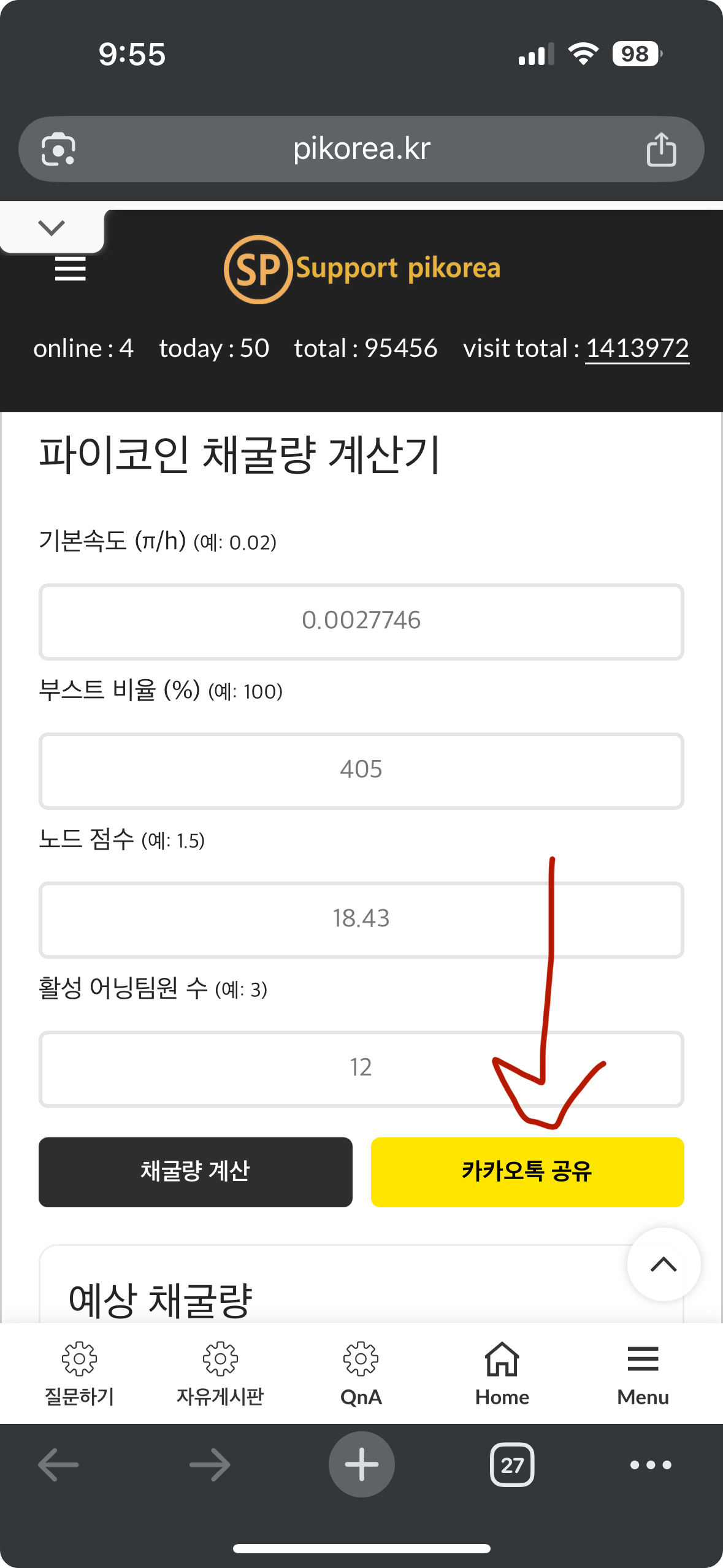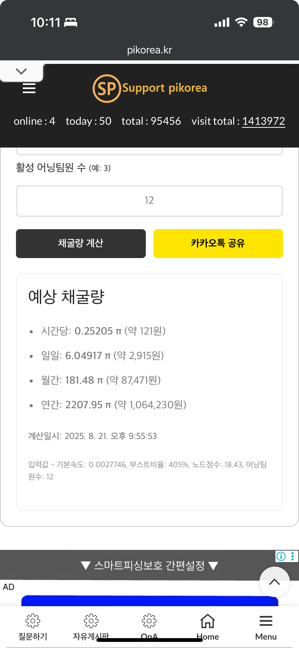 okx거래소 실시간 시세를 불러와서 현재 나의 보유 파이수량을 입력하면 원화로 계산됩니다. 그리고 현재 마이닝 속도, 부스트비율, 노드점수, 활성어닝팀원수를 입력해서 채굴량을 계산하고 원화로 얼마인지 알 수 있습니다. 계산결과값을 카카오톡 메시지로 전송할 수 있는 '파이코인 수익 예측 계산기'를 이용해 보세요.